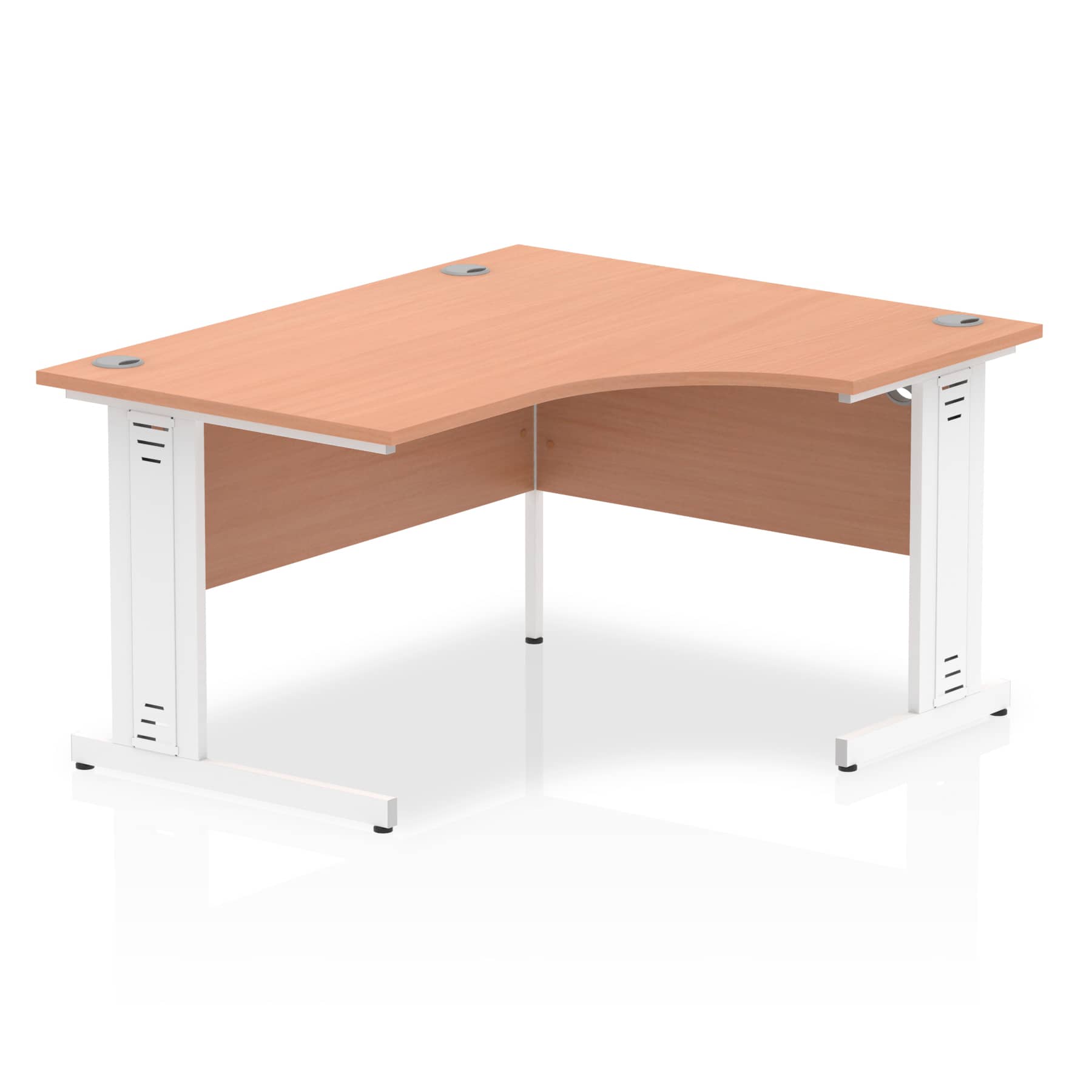 Impulse contract 1400 wide crescent desk 25mm tops Wire management panel Heat resistant beech melamine finish 18mm modesty panel 2mm protective abs edging White coated double strut legs 3 cable ports Height adjustable feet Steel to steel fixings 3 modesty panel slots 600 deep Deep set modesty panel (5) allows for compatibility of most screen clamp fittings Weight Capacity: 135Kg