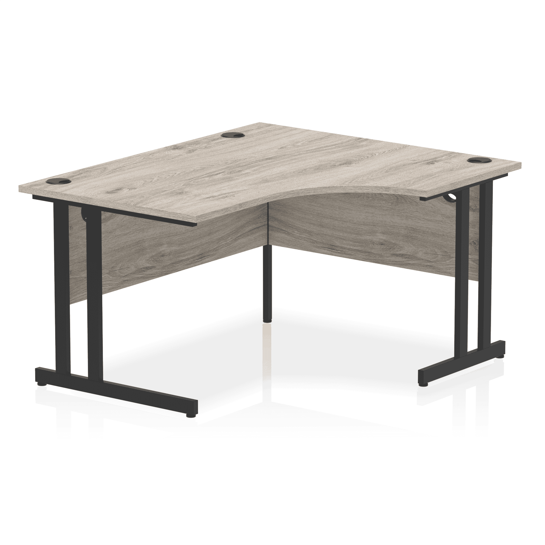 Impulse contract 1400 wide crescent desk 25mm tops Heat resistant grey oak melamine finish 18mm modesty panels 2mm protective abs edging Black coated double strut legs 3 cable ports Height adjustable feet Steel to steel fixings 3 modesty panels slots 600 deep Deep set modesty panel (5) allows for compatibility of most screen clamp fittings
