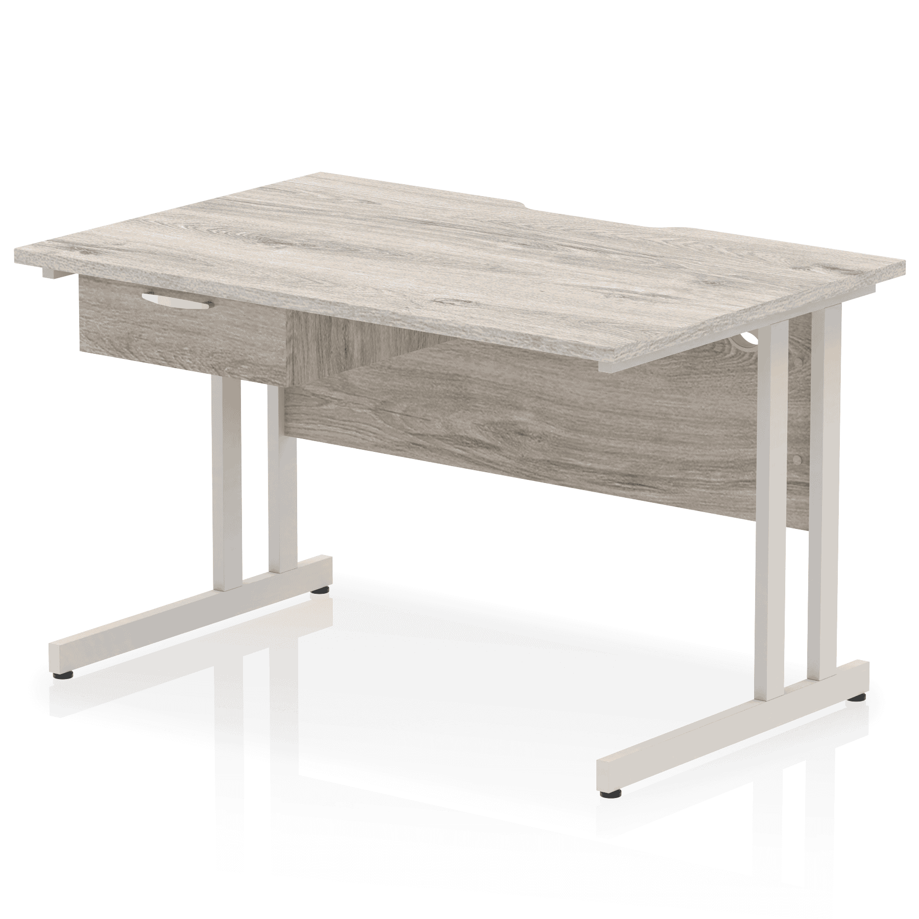 Impulse 1200 x 800mm Scalloped Edge Straight Office Desk Grey Oak Top Silver Cantilever Leg Workstation 1 x 1 Drawer Fixed Pedestal
