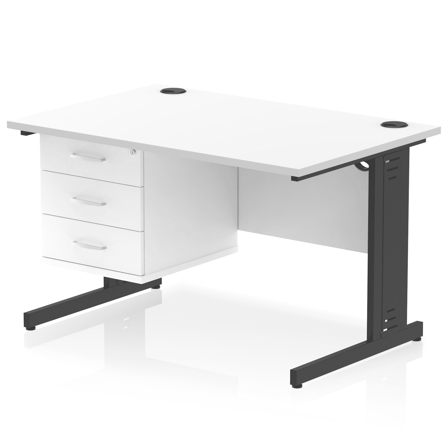 Impulse contract 1200 wide desk 25mm tops Heat resistant White melamine finish 18mm modesty panels 2mm protective abs edging Black coated cable managed legs 2 cable ports Height adjustable feet Steel to steel fixings 2 modesty panels slots Deep set modesty panel (5) allows for compatibility of most screen clamp fittings Fixed pedestal