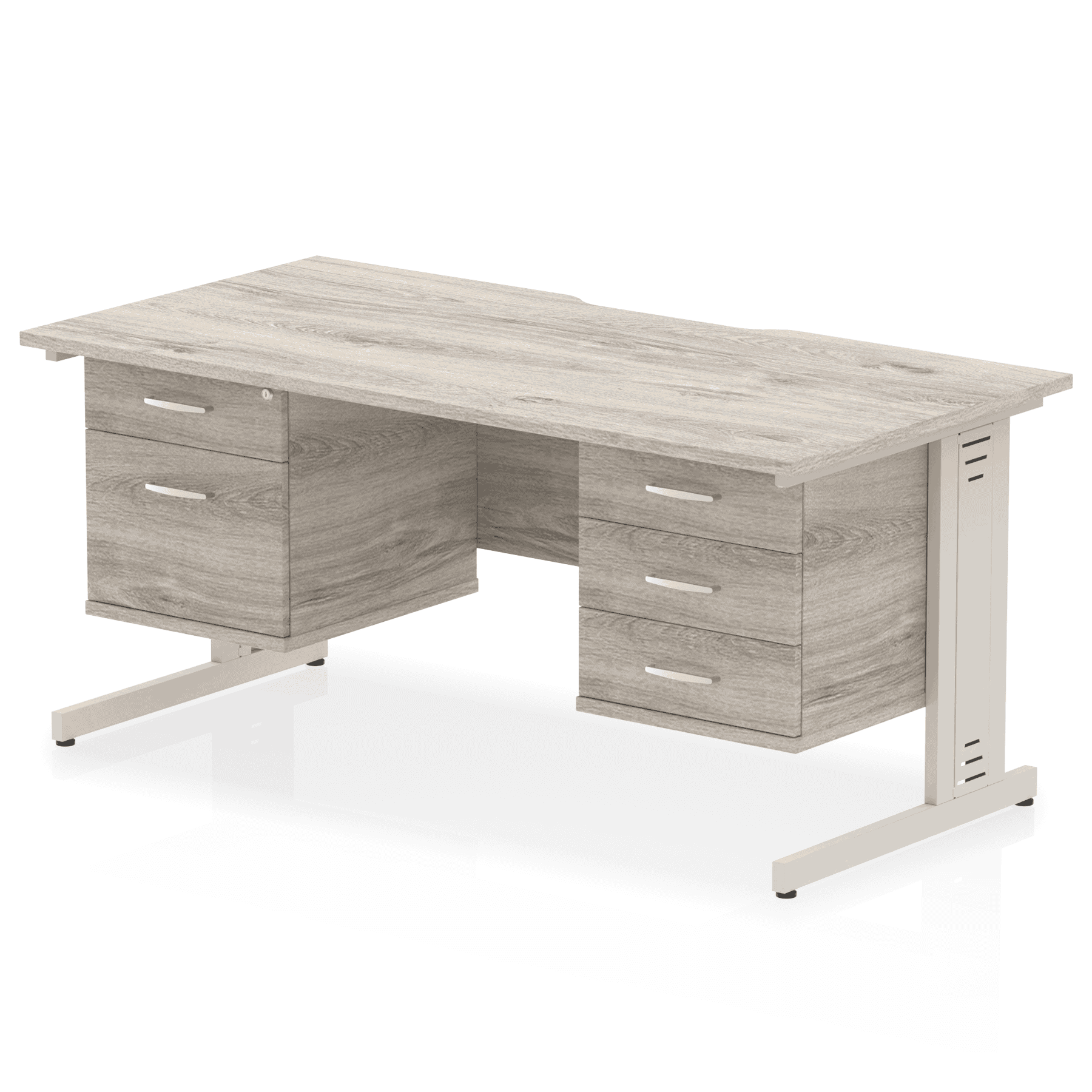 Impulse 1600 x 800mm Scalloped Edge Straight Office Desk Grey Oak Top Silver Cable Managed Leg Workstation 1 x 2 Drawer 1 x 3 Drawer Fixed Pedestal