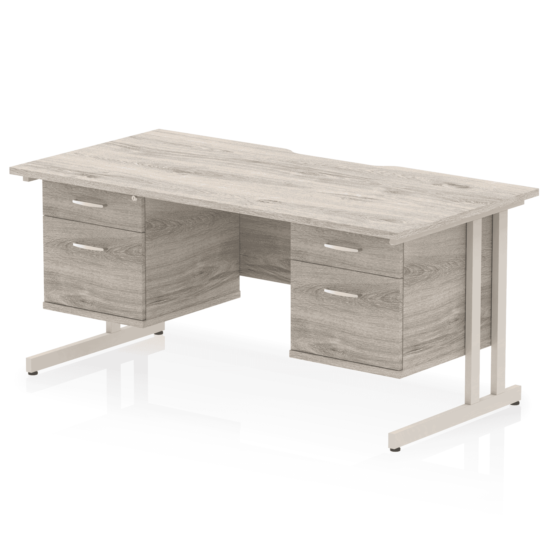 Impulse 1600 x 800mm Scalloped Edge Straight Office Desk Grey Oak Top Silver Cantilever Leg Workstation 2 x 2 Drawer Fixed Pedestal