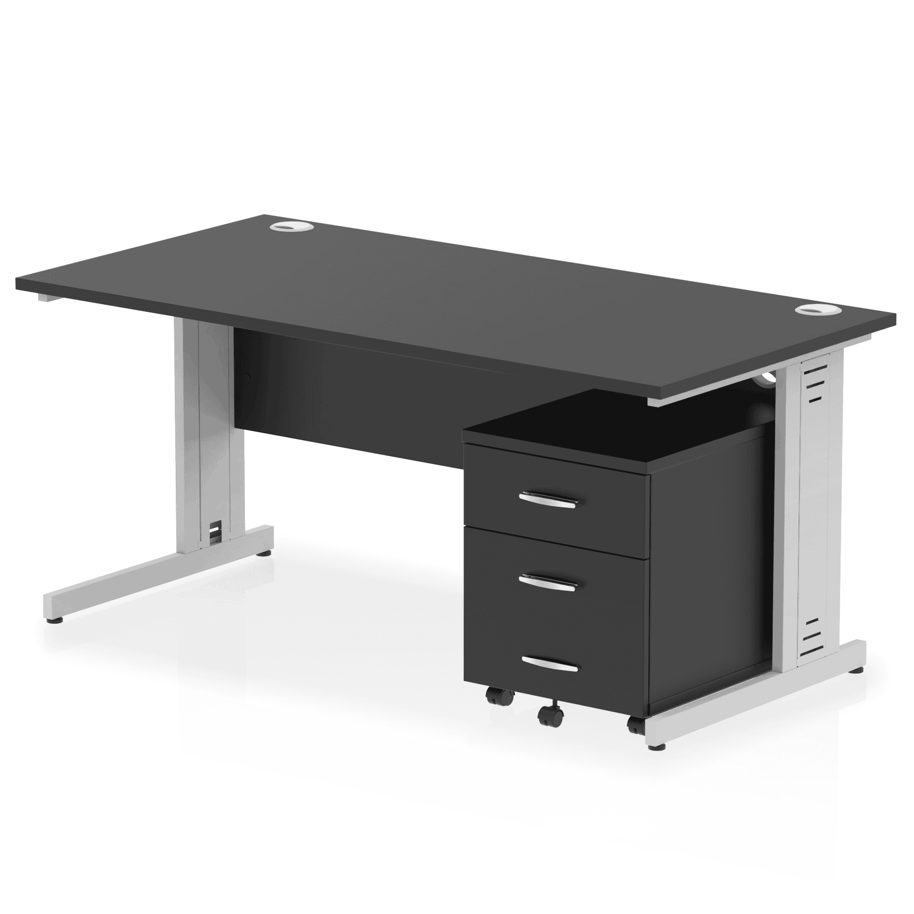 Impulse contract workstation 25mm tops Desk and pedestal combined Heat resistant Black melamine finish 18mm modesty panel 2mm protective abs edging Silver coated double strut legs with cable management Multiple cable ports Height adjustable feet Steel to steel fixings Modesty panel slots wire slots Deep set modesty panel (5) allows for compatibility of most screen clamp fittings