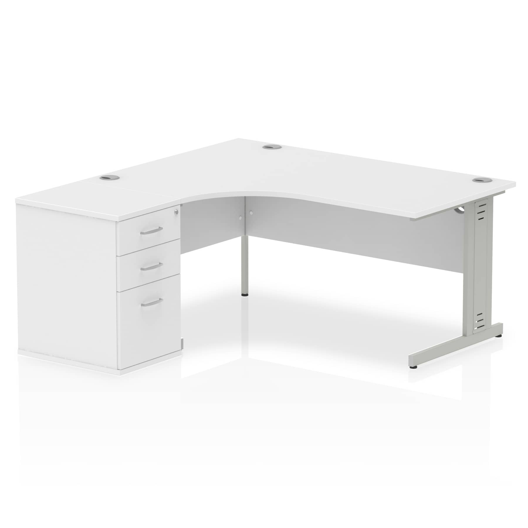 Impulse 1600mm Left Crescent Office Desk White Top Silver Cable Managed Leg Workstation 600 Deep Desk High Pedestal