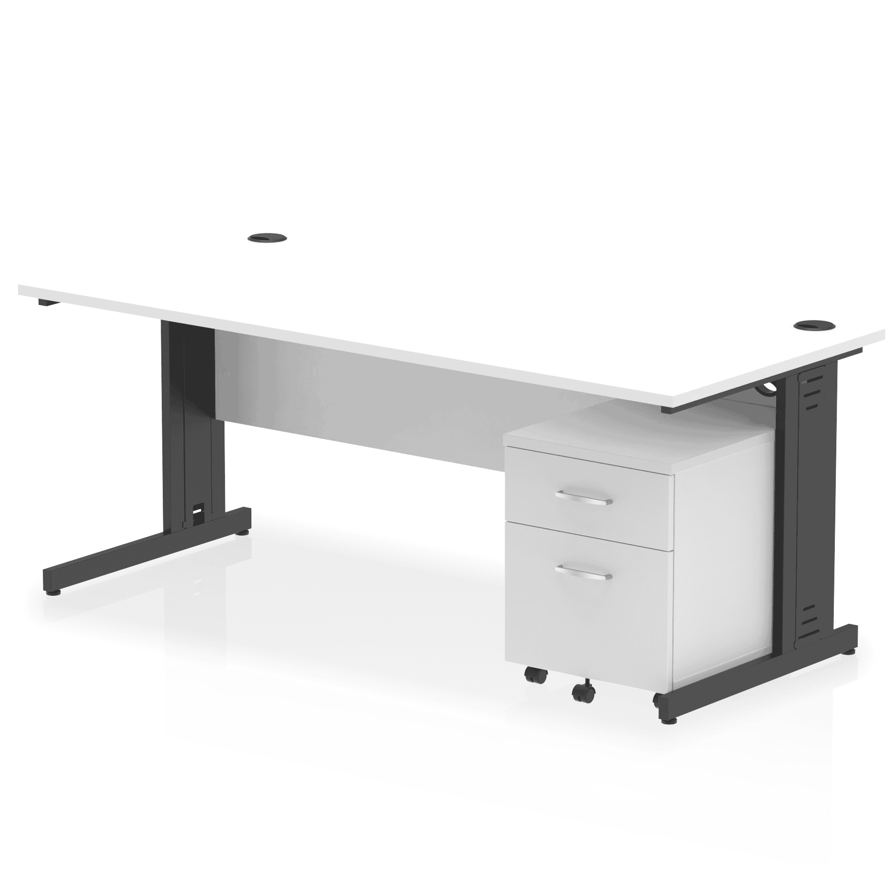 Impulse contract workstation 25mm tops Desk and pedestal combined Heat resistant White melamine finish 18mm modesty panel 2mm protective abs edging Black coated double strut legs with cable management Multiple cable ports Height adjustable feet Steel to steel fixings Modesty panel slots wire slots Deep set modesty panel (5) allows for compatibility of most screen clamp fittings